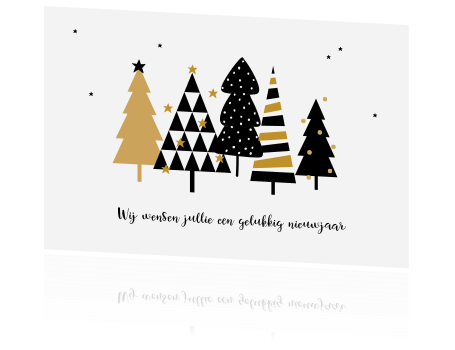 Kerstkaart met kerstbomen in goudkleur en zwart - coronavrij nieuwjaar